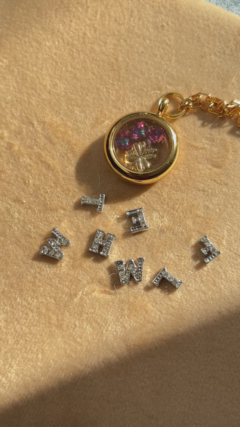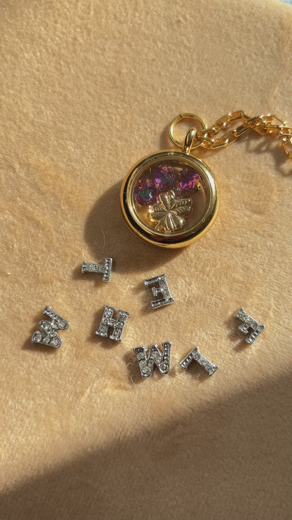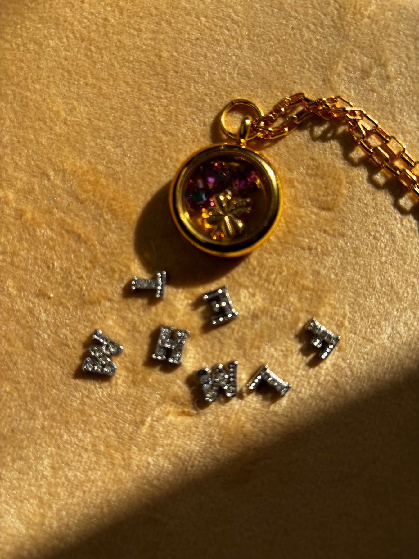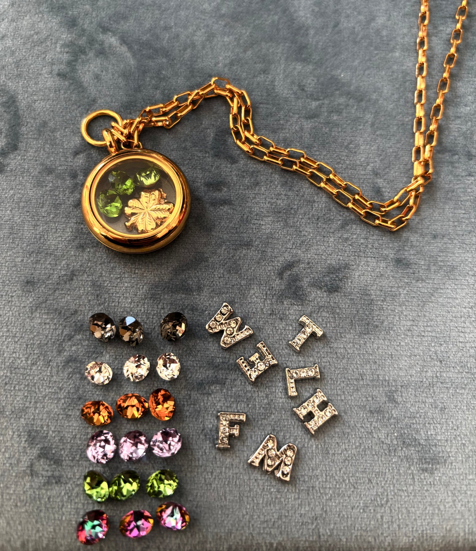 Medaillon rond en verre et laiton recouvert d’or 24carats, rempli de petits charms en Crystal monté sur une chaîne plaqué or.