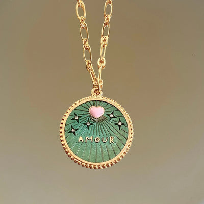 Médaille en plaqué or, strassée à la main à Paris avec le mot Amour en lettre d'or et un coeur émaillé bombé rose montée sur une chaine 55 cm.