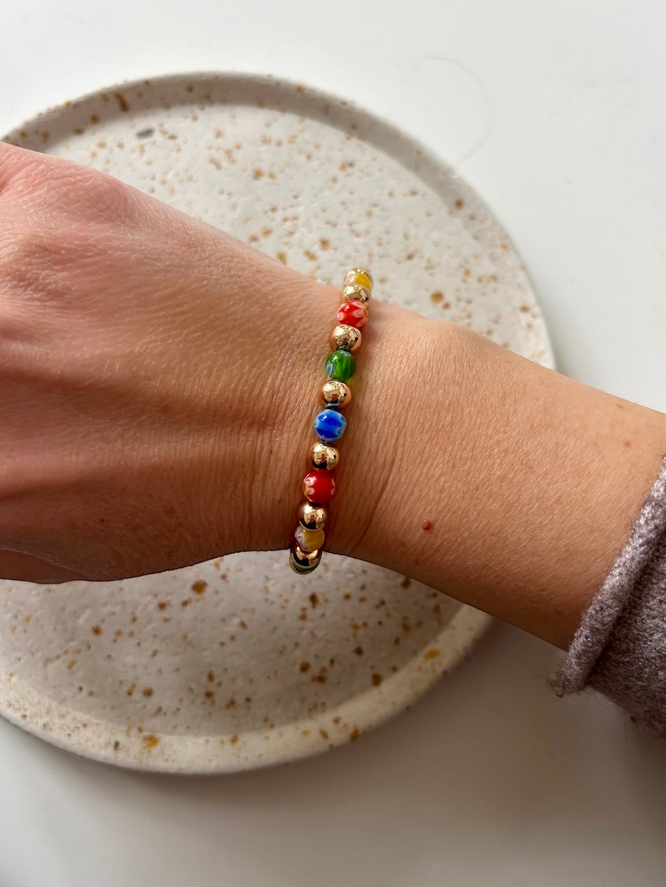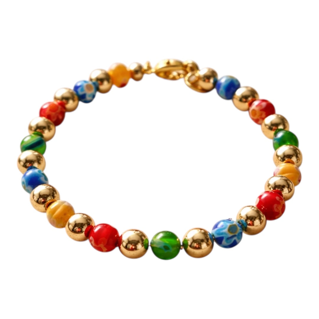 Bracelet composé de perles millefiori et de perles plaquées or.