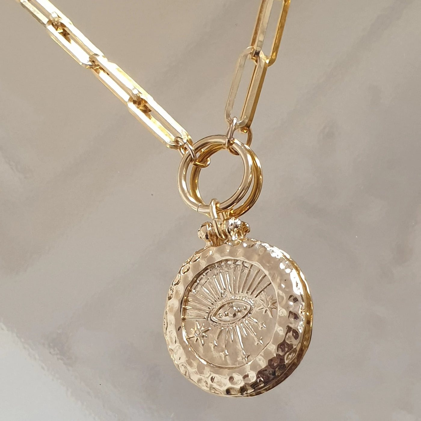 Collier d'une longueur de 50 cm ( ajustable plus court dans la maille ) composé d'une maille plate et d'une médaille oeil, talisman protecteur et porte bonheur.