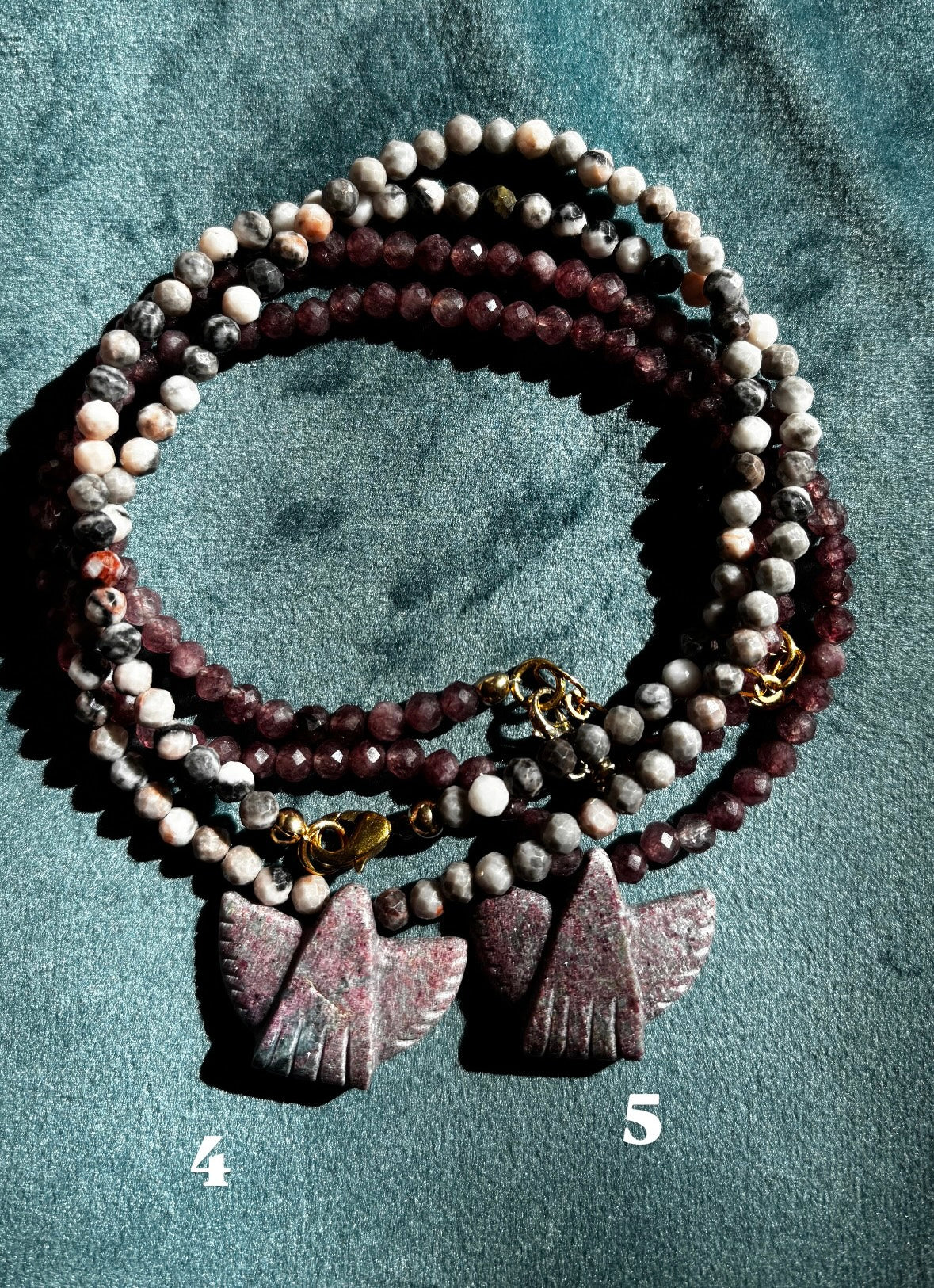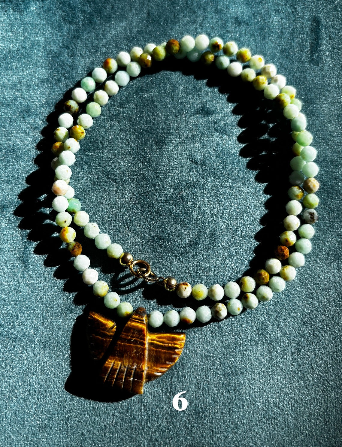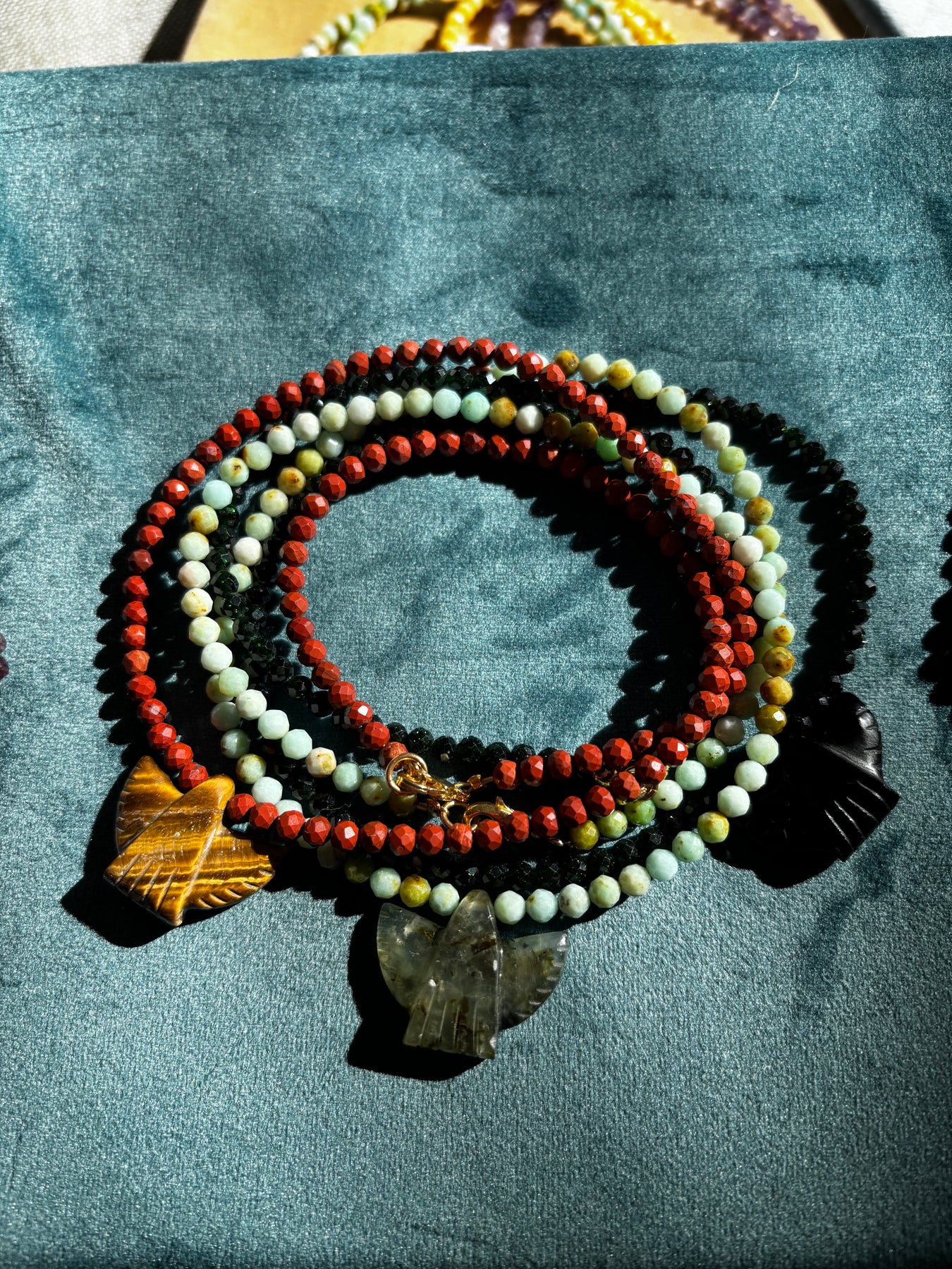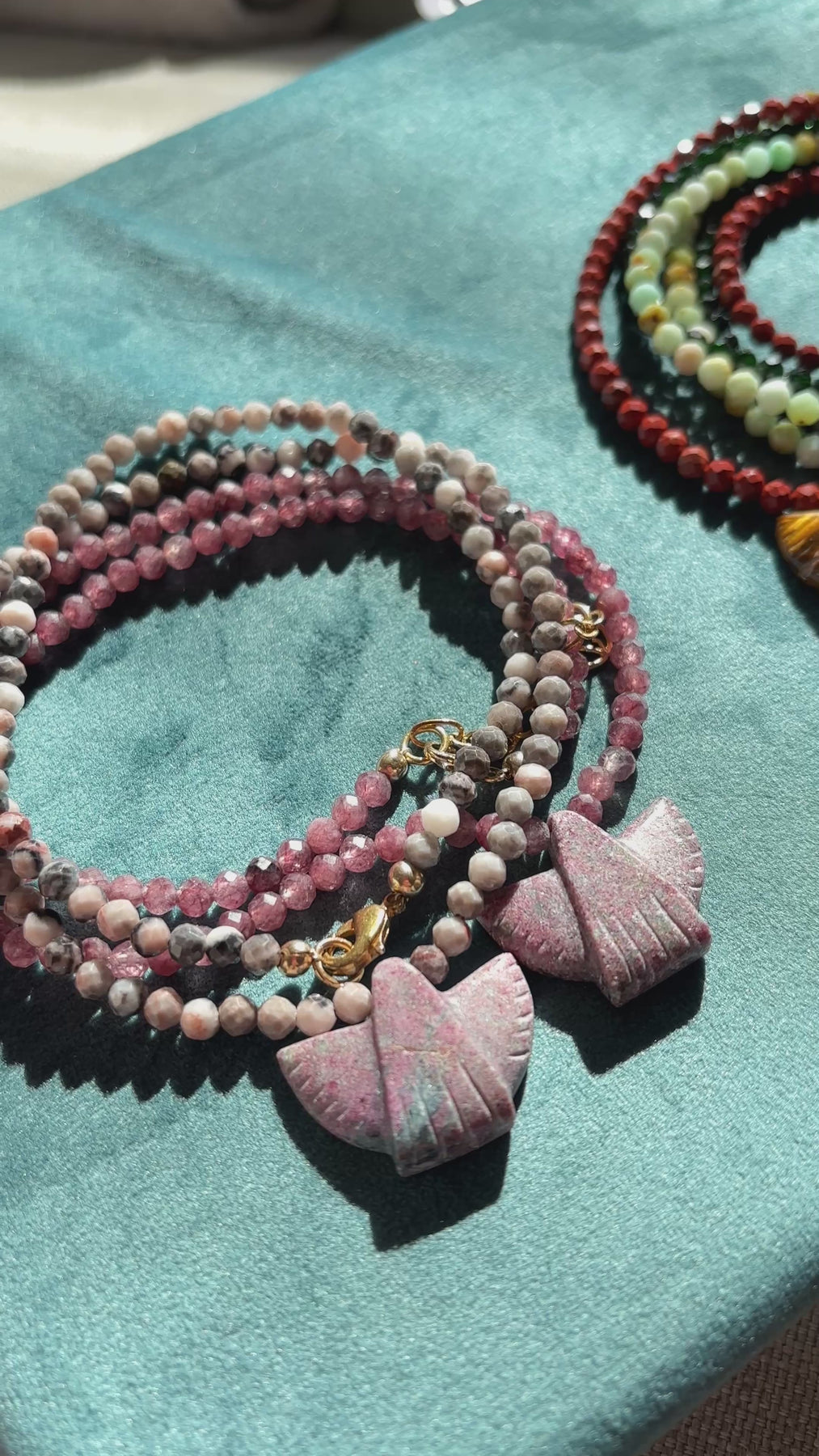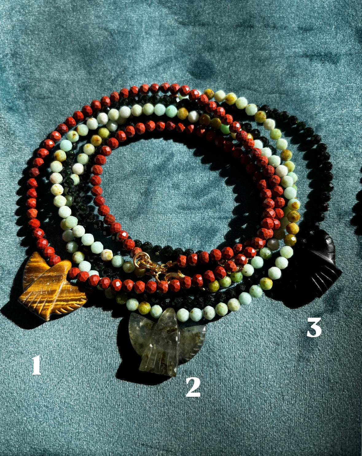 Condor en pierre semi-précieuses monté sur un collier de perles en pierres semi-précieuses.